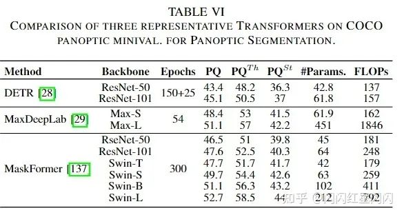 下表 6 侧重于评估全景分割任务。Max-DeepLab 通常通过掩码预测的方式解决全景分割任务中的前景和背景,而 Maskformer 成功地将此方式用于语义分割并统一了语义和实例级分割任务。基于它们在全景分割领域的表现,可以得出结论:Transformer 可以将多个分割任务统一到一个具有掩码预测的无框框架中。