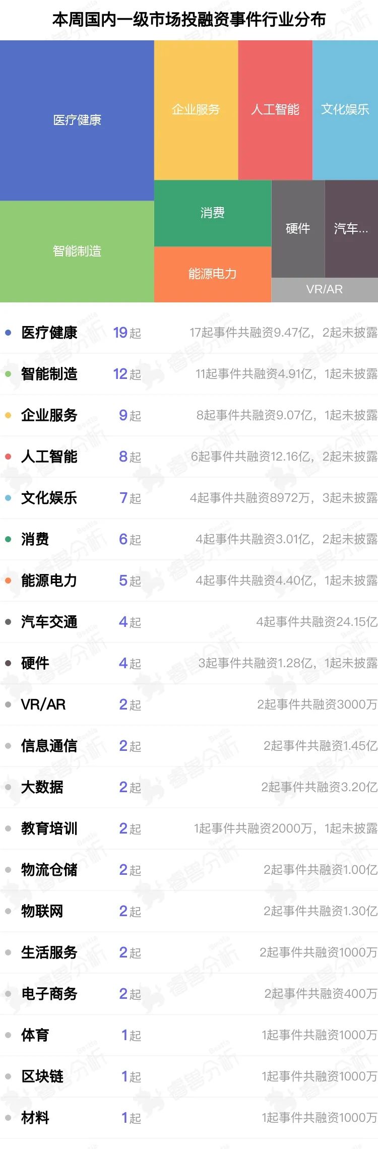 从融资案例数量来看,本周医疗健康、智能制造、企业服务领域融资最活跃,分别为19起、12起、9起。