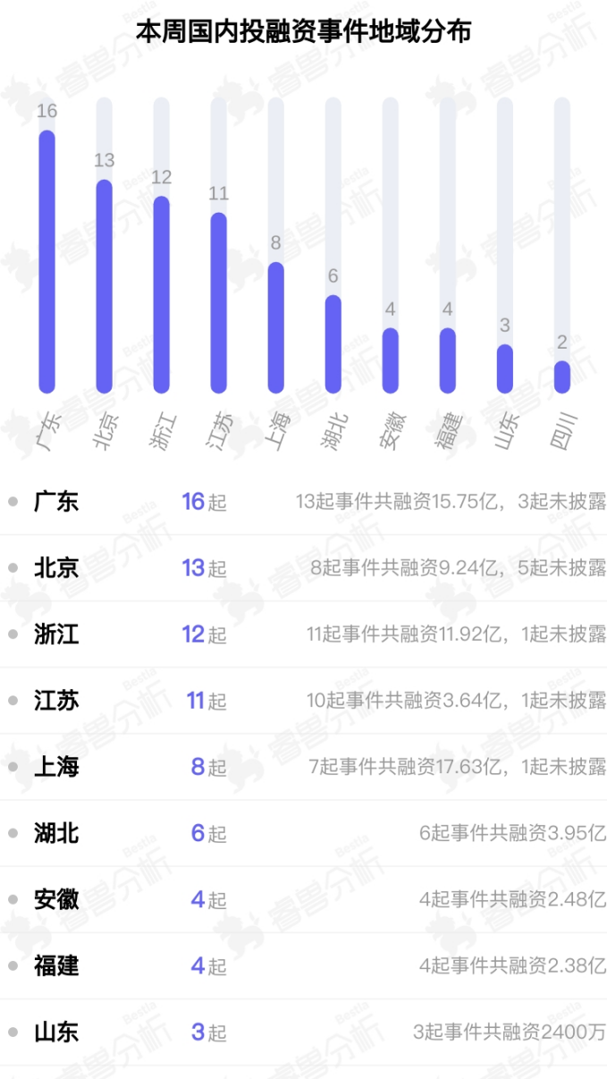 从本周披露获投企业的地域分布来看,主要集中在广东、北京、浙江。其中广东发生16起,北京发生13起,浙江发生12起。