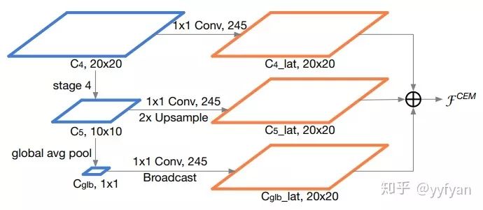 ThunderNet是做ARM上实时的目标检测算法,主要简化了FPN结构,只使用C4/C5,同时引入gpooling操作(Face++论文好多这么用,确实有效),最终输出C4分辨率大小的累加特征。