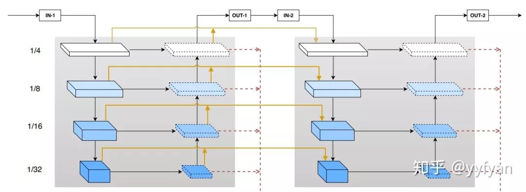 一个FPN有效,2个FPN是否有效,MSPN当然还有其他创新点,不同于FPN固定通道256,而是与backbone一致,同时还有一个特征融合模块,解决梯度消失和特征重利用。这个是做姿态估计的,其实这个结构在其他任务上也是work的。