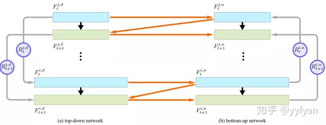 ZigZagNet在PANet上进行改进,使得top-down和bottom-up之间进行交互,同时使top-down和bottom-up的每一层之间也进行信息交互。这样就完成了双方向上的多尺度上下文信息加强。