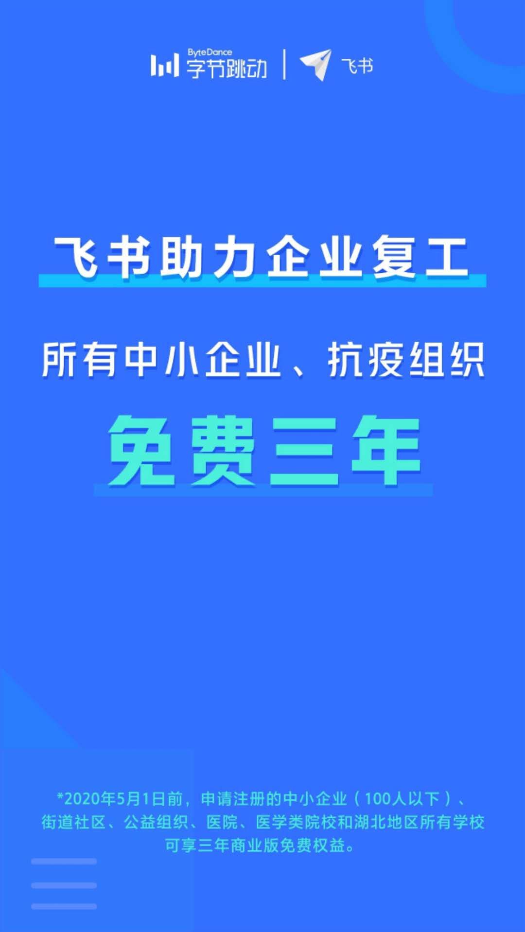 在此,我们也致敬所有维护社会运转,并守护员工健康的组织和机构,对他们表示感谢。因为现在中小企业遇到的发展困难还是蛮大的,所以今天经过非常认真地讨论之后,我们决定给中小企业提供一个额外的福利,在我们通用的功能之外,为他们提供飞书商业版本三年的免费使用权,希望为社会尽一份力。大家各自尽各自的努力,来帮助这个社会发展得更好。