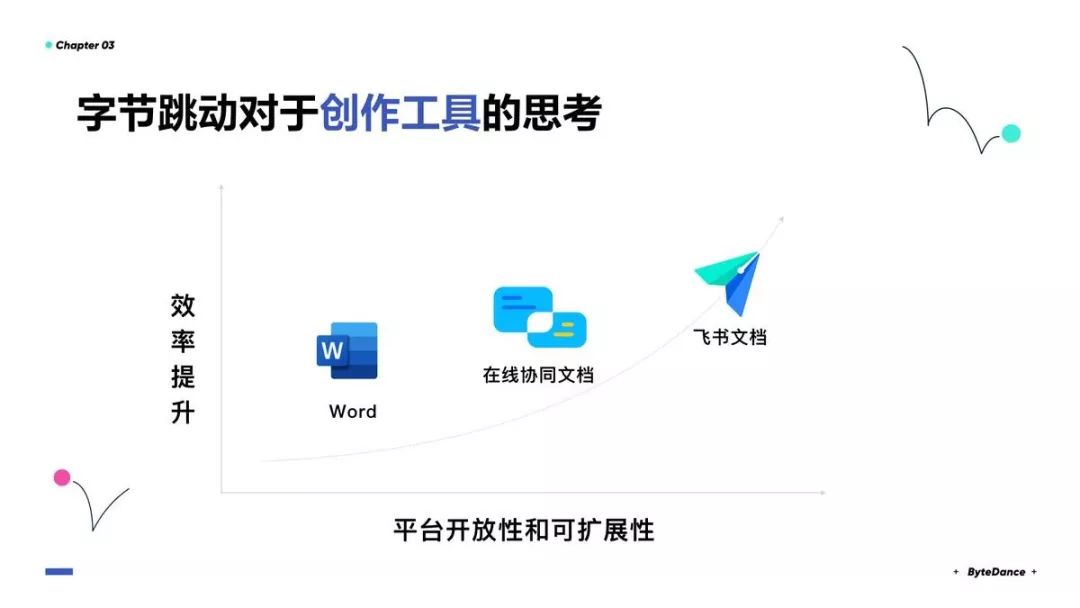字节跳动更换过多款沟通工具。因为,我们认为,沟通对于信息的创造、分发、流转和消费,至关重要,甚至是公司最重要的一个通用工具。2012年字节跳动成立以来,每个时刻都努力使用当时我们认为最先进、最好用、最适合我们的工具。