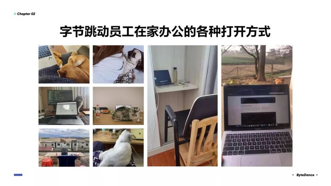 每个人在家办公环境都不太一样。我们有些员工拍了自己的办公环境,大家可以看到非常五花八门,非常有意思。有人是跟猫猫狗狗在一起工作,有人是在室外工作,还有人把家里的衣柜搬出来办公。