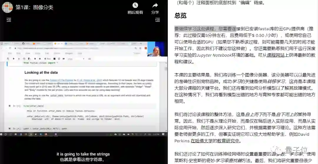 在Fast.ai官网上,每一节课的页面,左边是视频播放,右边有本节提纲,和其他网友详细的学习笔记链接。此外还有各种丰富的扩展资料。