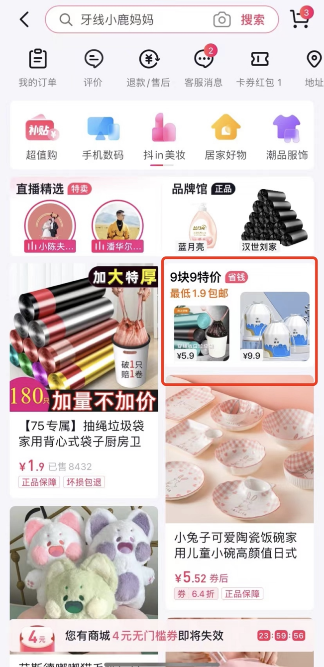 首先,特价专区的商品单价原本就不高。抖音极速版、拼多多的特价包邮专区中,主要以日货品为主,垃圾袋、纸巾不仅是数量最多的品类,也是销量最高的品类。