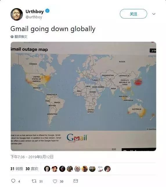 3月13日,众多Gmail用户在社交媒体上表示,Gmail在全球范围内出现了不同规模的宕机,目前涉及范围较广,其中包括北美洲、南美洲、欧洲和亚洲的部分地区。Google旗下在线云储存服务Google Drive也出现了相似情况。