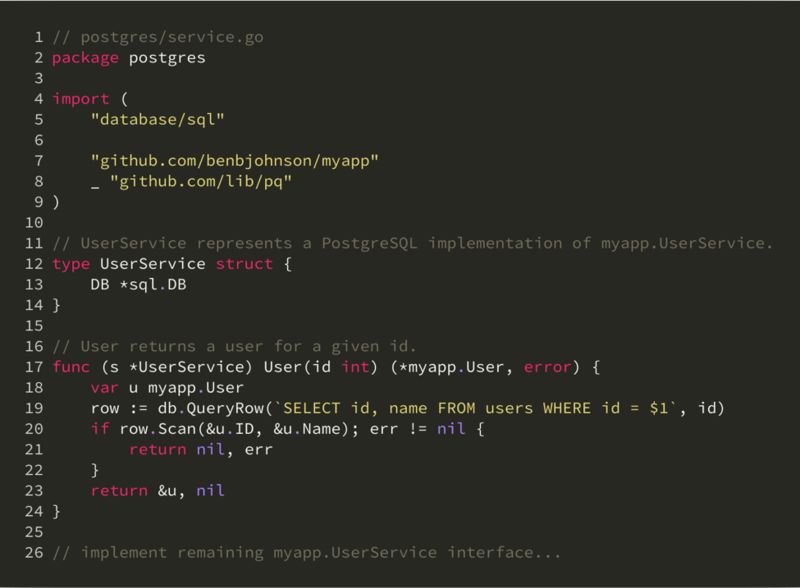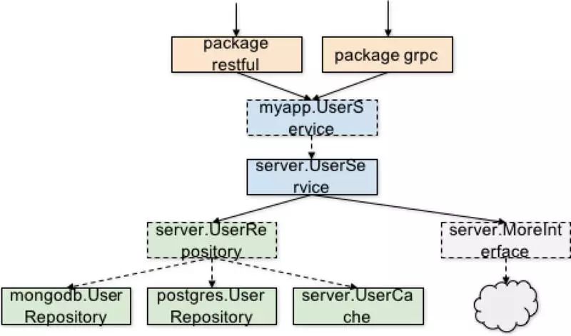 接下来,按照外部依赖对实现代码进行包的划分。例如如果 UserService 是依赖 PostgreSQL 作为存储实现的,那么可以用一个 postgres 的子 package 来包含实现代码: