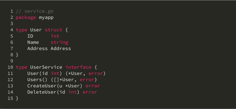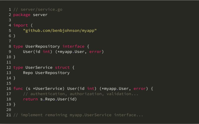 从 MVC 的角度看,这里的 UserService 属于 model 层次。在其上还有对接 HTTP API 的 view-controller 层。可以想象 view-controller 层需要依赖并利用 UserService,这里不再展开代码。这里的关键是,包的命名不再是 models 或这 controllers,而是按照外部依赖而命名。那么当包外引用 UserService 的时候,它的形式会是 postgres.UserService,非常简洁易理解。