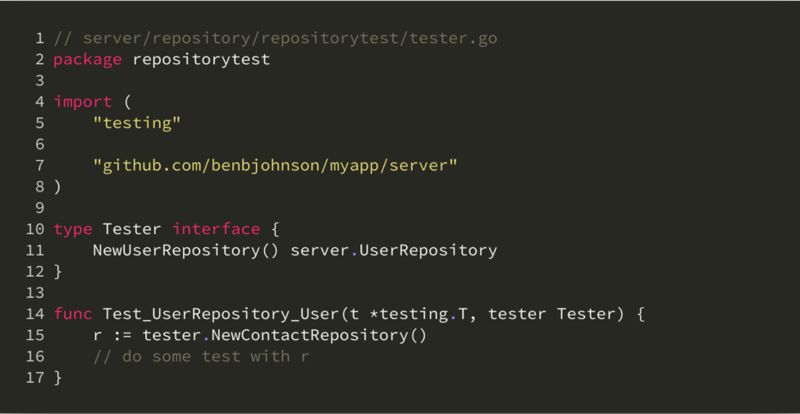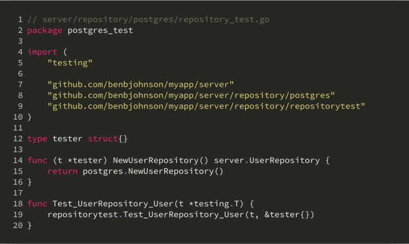在这一层的集成测试中,我们主要关注它每个接口的功能是否正确,实际上是一种功能测试。例如 User 函数在给定某个已有用户的 id 时应能返回这个用户,而当给定的 id 不存在时,应返回适当的错误。不管接口的具体实现是怎么样的,从使用的角度它们应该具备一致的功能,因此对于同一个接口的不同实现,它们的集成测试样例可以共享。这就对应我们上面目录结构中的 repositorytest 包的作用,它包含了 UserRepository 通用的功能测试样例: