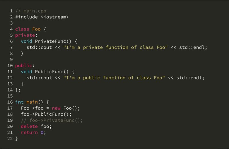 但是如果代码量稍大,或者存在团队协作情形的项目,这样的组织方式就暴露无法隐藏结构体内部实现的问题了。不同于 C++ 或 Java,Golang 的代码可见性的最小粒度是 package。例如在下面的 C++ 代码中,我们 Foo 类的外部是无法调用它的私有函数 PrivateFunc 的: