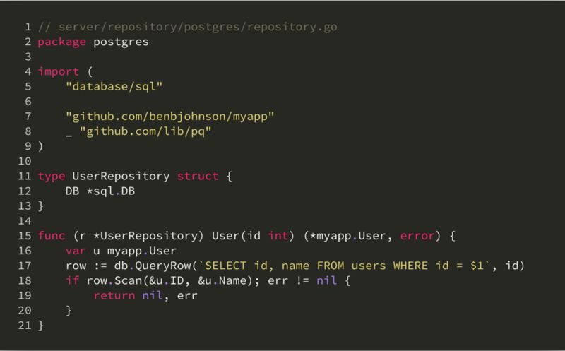 继续沿用上面的例子,我们可以将数据库操作抽离成一个 UserRepository 接口,postgres 包改为实现 UserRepository 接口: