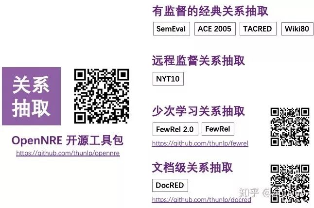 我们课题组从 2016 年开始耕耘实体关系抽取任务,先后有林衍凯、韩旭、姚远、曾文远、张正彦、朱昊、于鹏飞、于志竟成、高天宇、王晓智、吴睿东等同学在多方面开展了研究工作。去年在韩旭和高天宇等同学的努力下,发布了 OpenNRE 工具包 [33],经过近两年来的不断改进,涵盖有监督关系抽取、远程监督关系抽取、少次学习关系抽取和文档级关系抽取等丰富场景。此外,也花费大量科研经费标注了 FewRel(1.0 和 2.0)和 DocRED 等数据集,旨在推动相关方向的研究。