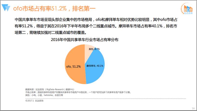与此同时,共享单车品牌也开始迅速兴起,hellobike获得数千万元天使轮,小鸣单车获得1亿元A轮融资,一步单车获得2亿元融资,优拜单车整个A轮融资达2.5亿元。
