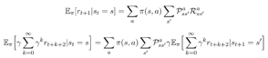 在这里期望可以被描述如果我们采取策略Π时,继续从状态s出发的期望回报。可以通过对所有可能的动作和所有可能的返回状态的求和来描述期望。接下来的两个方程可以帮助我们迈出下一步。