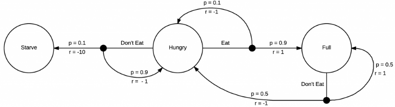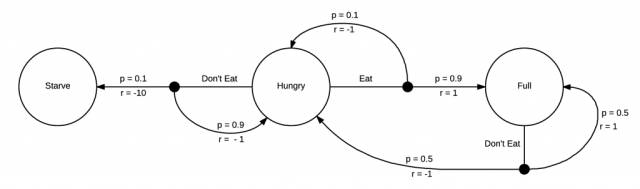 由于这个MDP是十分简单的,我们很容易发现待在一个更高奖励的区域的方式,即当我们饥饿的时候就吃。在这个模型中,当我们处于吃饱状态的时候没有太多其它的选择,但是我们将会不可避免的再次饥饿,然后立马选择进食。强化学习感兴趣的问题其实具有更大更复杂的马尔科夫决策过程,并且在我们开始实际探索前,我们通常不知道这些策略。
