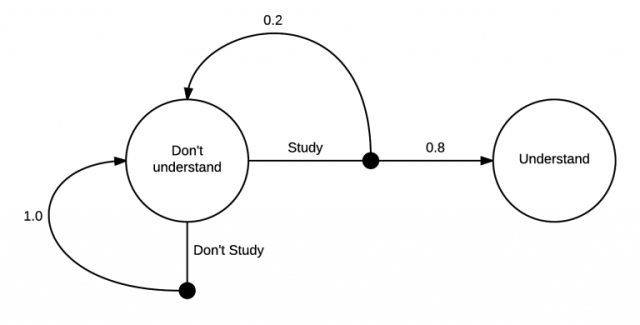 这个MDP展示了学习马尔科夫决策的过程。在最开始你在一个“不理解”的状态中,接下来,你有两个可能的动作,学习或者不学习。如果你选择不学习,则有100%的可能性返回到不理解的状态里。但是,如果你选择学习,只有20%的可能性让你回到最开始的地方,即80%的可能性变成理解的状态。