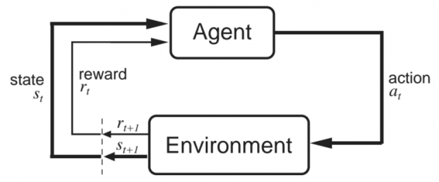 来自Sutton和Barto的书“Reinforcement Learning: an Introduction”(这是强烈推荐的)的这张图,很好的解释了智能体和环境之间的相互作用。在某个时间步t,智能体处于状态s_t,采取动作a_t。然后环境会返回一个新的状态s_t+1和一个奖励r_t+1。奖励处于t+1时间步是因为它是由环境在t+1的状态s_t+1返回的,因此让它们两个保持一致更加合理(如上图所示)。