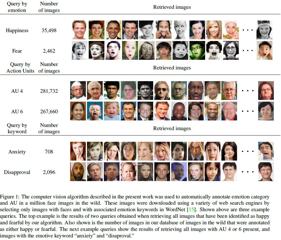 关于人脸表情识别的讨论一直在继续,很多学者团队都聚焦于此。文献【17】提出了用于注释自然情绪面部表情的一百万个图像的大型数据库(即,从因特网下载的面部图像)。首先,证明这个新提出的算法可以跨数据库可靠地识别AU及其强度。根据调研,这是第一个在多个数据库中识别AU及其强度的高精度结果的已发布算法。算法可以实时运行(> 30张图像/秒),允许它处理大量图像和视频序列。其次,使用WordNet从互联网下载1,000,000张面部表情图像以及相关的情感关键词。然后通过我们的算法用AU,AU强度和情感类别自动注释这些图像。可以得到一个非常有用的数据库,可以使用语义描述轻松查询计算机视觉,情感计算,社会和认知心理学和神经科学中的应用程序。