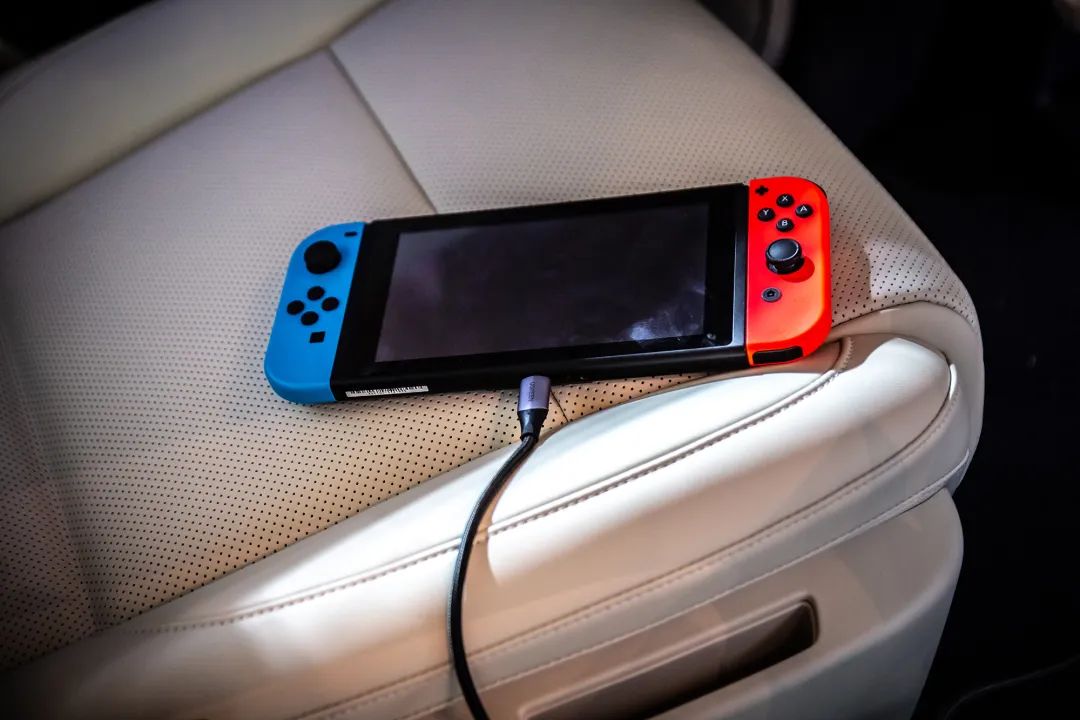 对了,除了与副驾屏一样的影音娱乐功能,二、三排乘客还能通过 Type-C 接口,连上 Switch 或 PS5 主机玩游戏。目前还不知道前排乘客是否能用储物箱里的 Type-C 接口连接设备加入游戏中,硬件理论上是支持的。