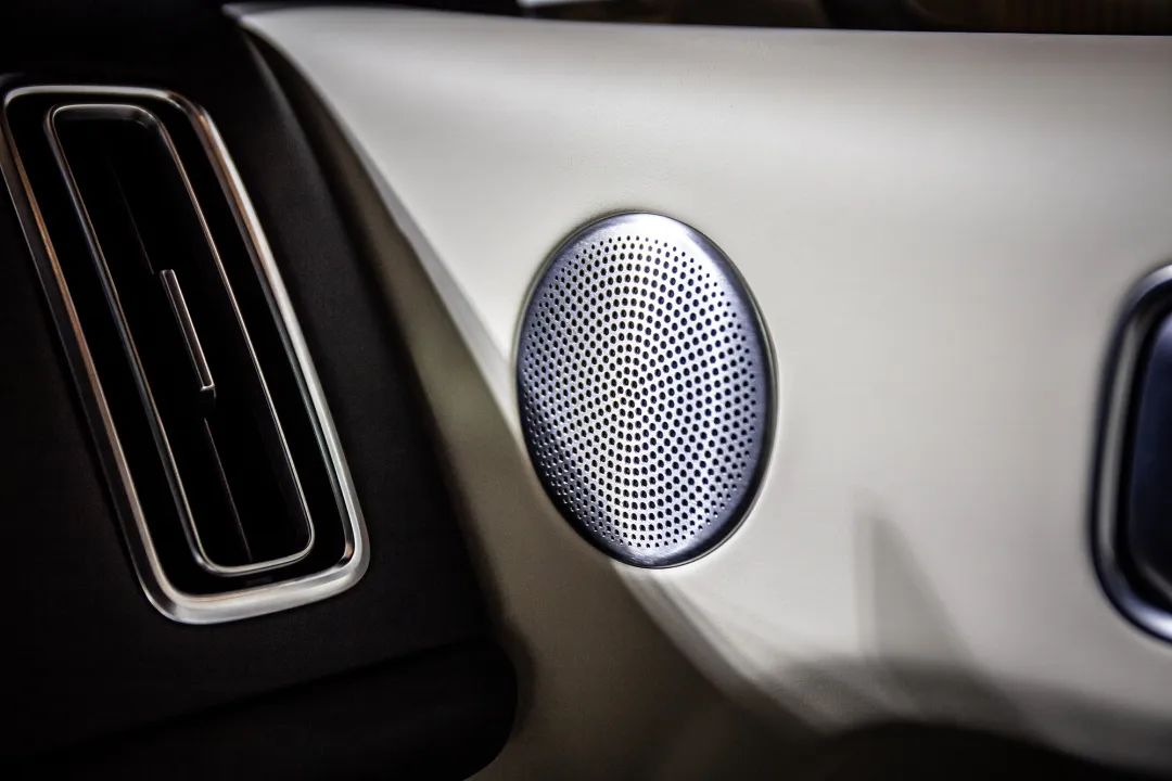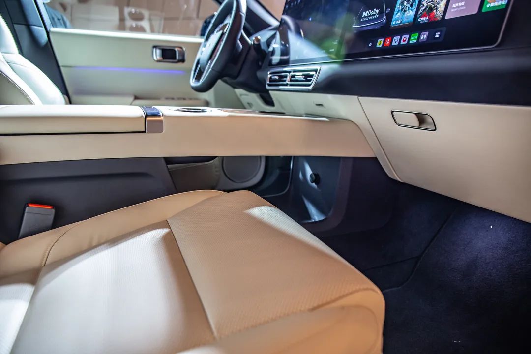 第二、三排乘客的影音娱乐体验,交由悬在车顶的电动折叠 15.7 英寸屏幕完成。全车三块 15.7 英寸的屏幕是互相打通的,内容共享只需长按内容卡片,再用屏幕手势一滑,搞定。