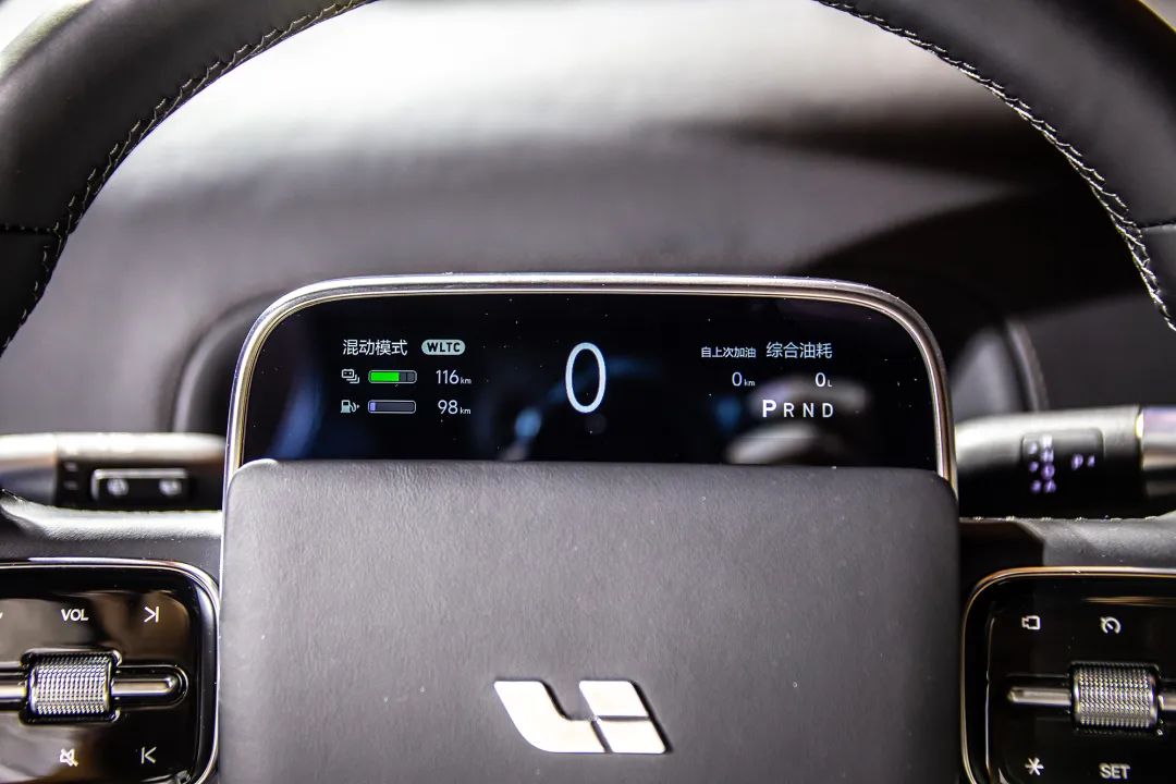 好用,意味着要适当做一点减法,比如取消“仪表盘”。L9 的仪表盘取消了,但不是完全取消,关于驾驶的信息被放在方向盘上的驾驶安全交互屏中显示,显示内容也很简单,左边是续航里程,右边可切换油耗、电耗显示,外加档位和车速信息。