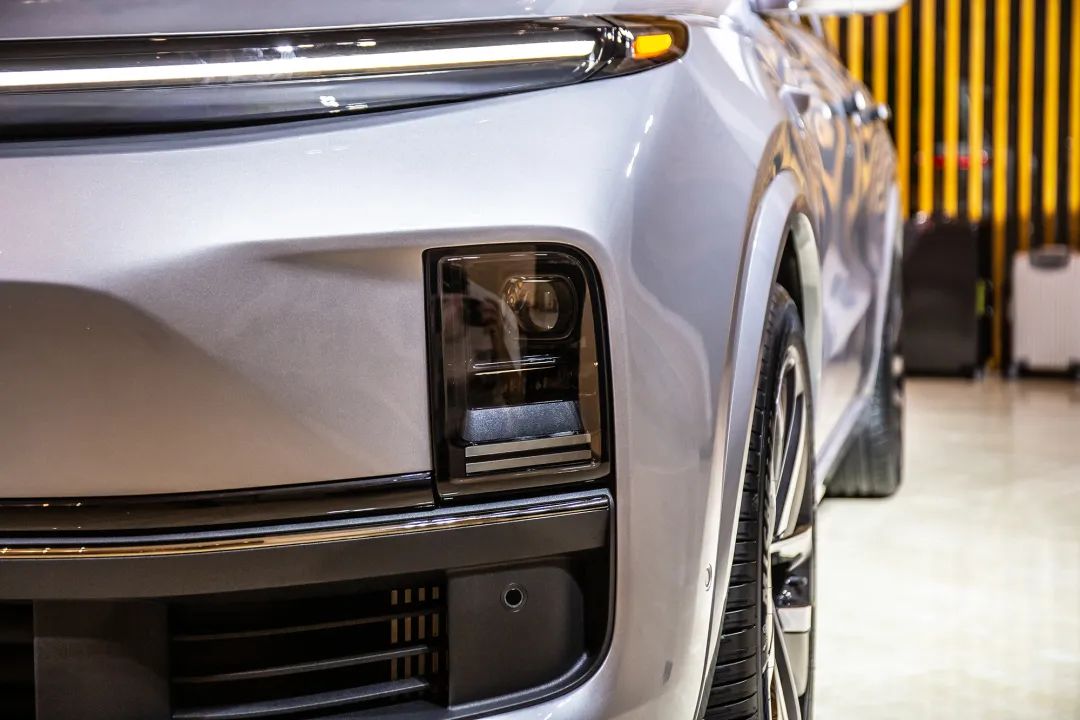 为了突出 L9 新能源的一面,理想的设计师将增程器进气格栅设计在车头的下部,上半边则是整块“留白”,这是纯电动车上比较常用的设计。L9 的前大灯配有透镜,并重点优化了 30-50m 中近距离的照射强度,此外还有与之搭配的转向辅助照明灯。