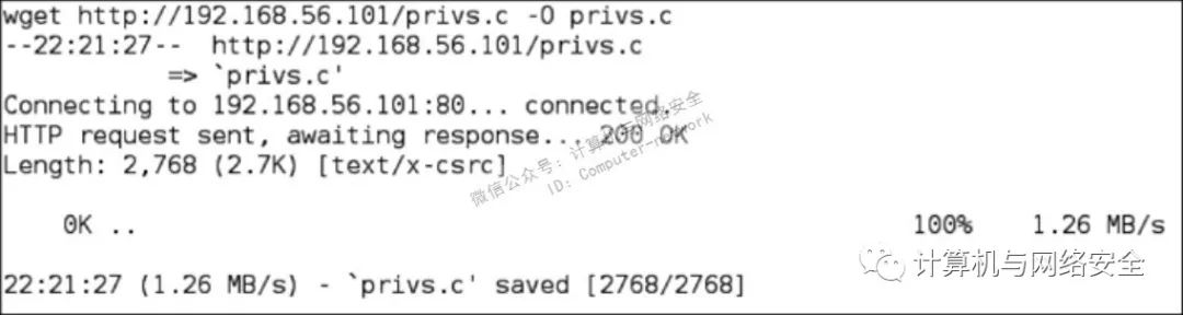 我们搜索 exploit-db 的资料库,发现某个 exploit 程序可将我们的权限提升为root权限。下一步,我们在测试主机上保存exploit程序,然后使被测主机从测试主机下载这个程序。有关指令如图4所示。