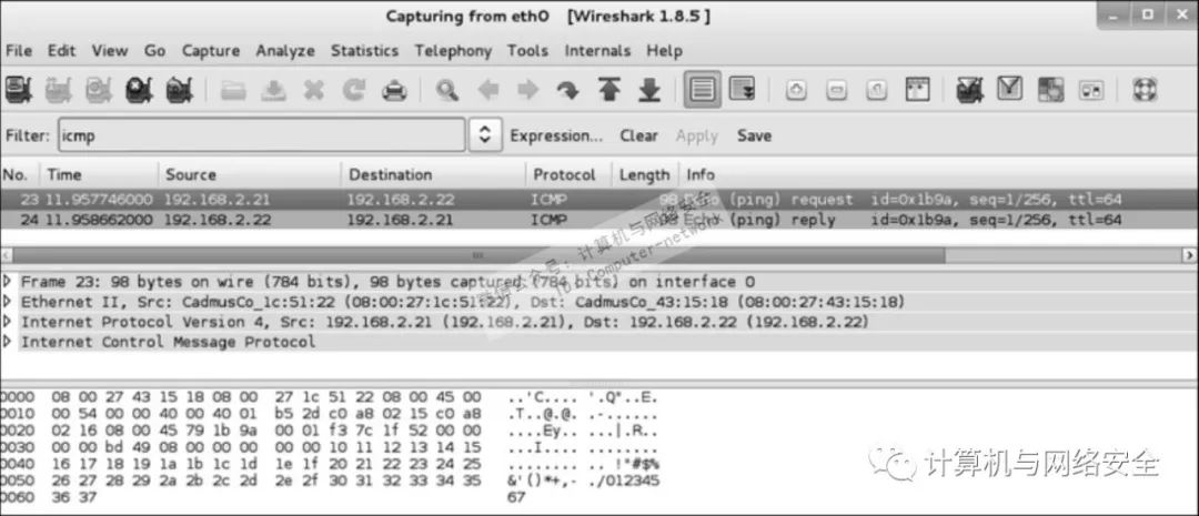 在图31中,我们在Filter栏里设定好了过滤规则icmp,以使程序只显示ICMP协议的数据包。
