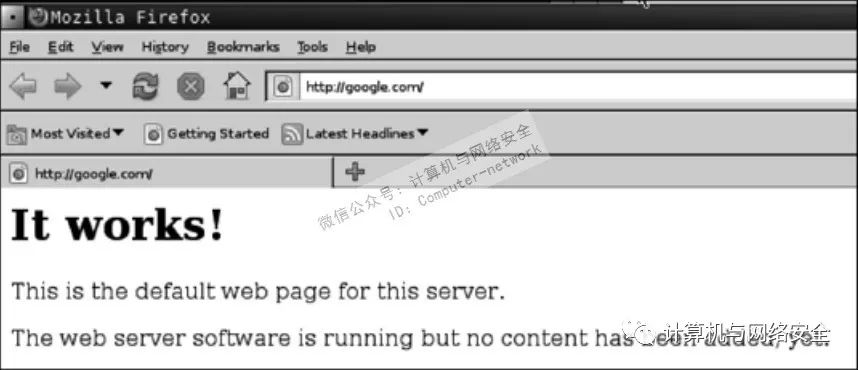 上述情况表明,DNS欺骗已经奏效。被测主机没有看到真正的Google网站,它的浏览器访问的是攻击人员部署的Web服务器。