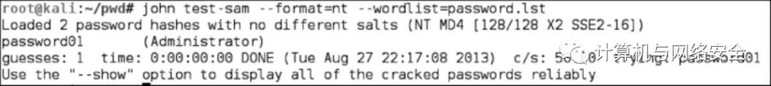 ● 离线攻击:这种攻击手段意在获取目标主机上的密码 hash 文件,并将该文件复制到攻击人员的主机。此后,攻击人员就可使用密码破解工具破解密码文件。这种方法的优点是无须顾及被测主机上的密码阻止策略(账户锁定等设置),因为有关破解工作是在攻击人员的主机上完成的。