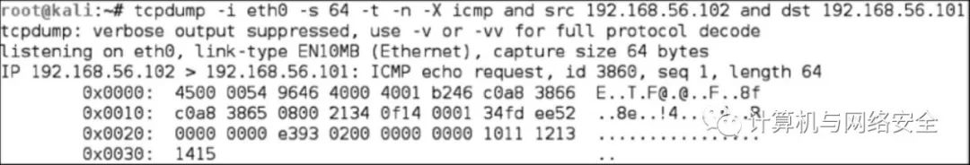 # tcpdump -n -t -X -i eth0 –s 64 icmp and src 192.168.56.102 and dst192.168.56.101