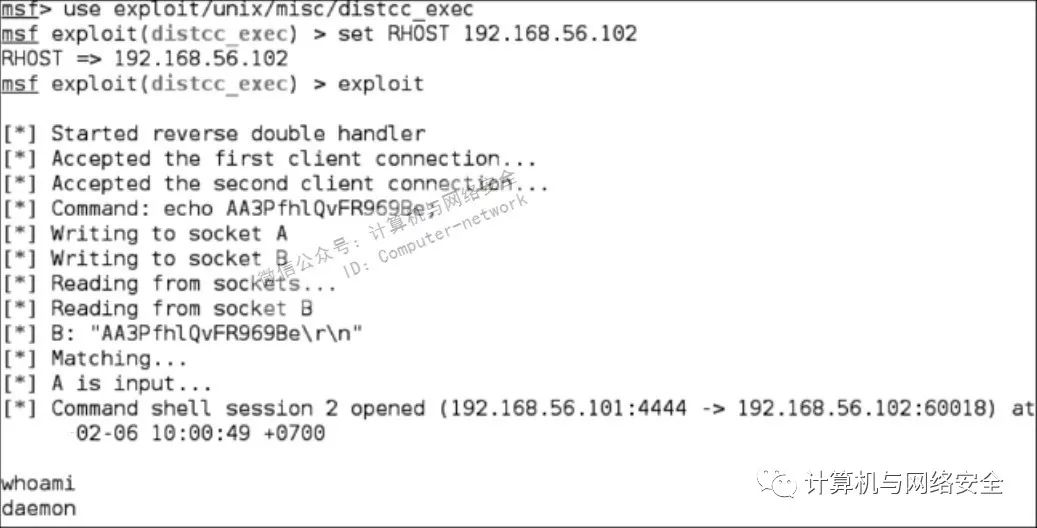 我们通过这个exploit利用了该服务的漏洞。而后,我们通过操作系统的指令看到已经获取到的权限是daemon的权限。