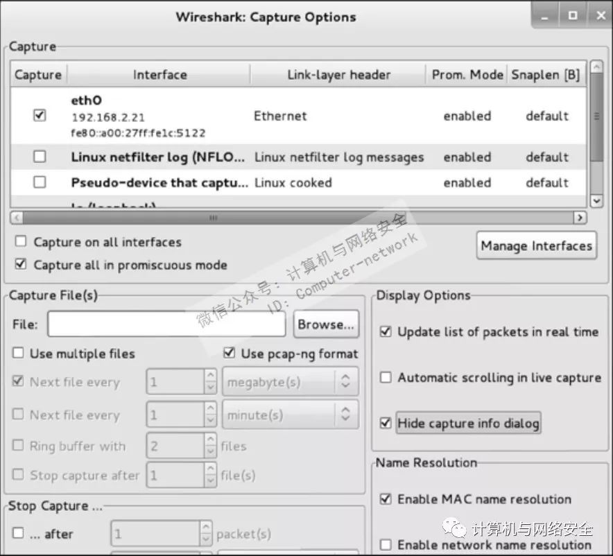 如果需要调整捕获数据包的具体设置,可在菜单Capture | Options 中调整相应的选项,或在Wireshark 主界面中直接选中Capture Options 的图标(见图32)。