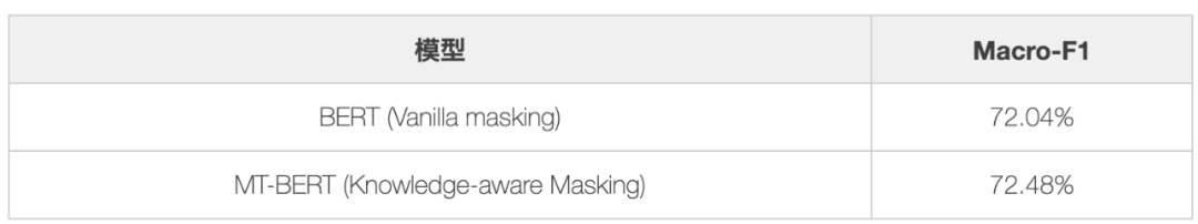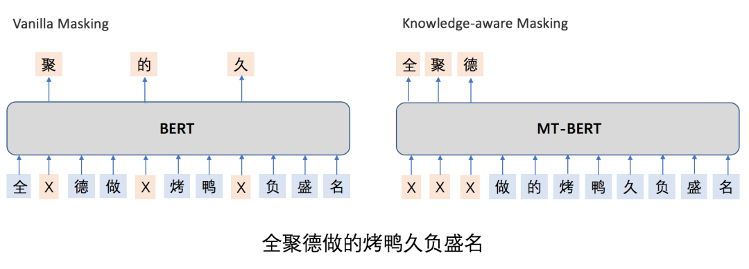 BERT模型通过字的搭配(比如“全X德”),很容易推测出被“掩盖”字信息(“德”),但这种做法只学习到了实体内单字之间共现关系,并没有学习到实体的整体语义表示。因此,我们使用Knowledge-aware Masking的方法来预训练MT-BERT。具体的做法是,输入仍然是字,但在随机"遮蔽"时,不再选择遮蔽单字,而是选择“遮蔽”实体对应的词。这需要我们在预训练之前,对语料做分词,并将分词结果和图谱实体对齐。图6右侧展示了Knowledge-aware Masking策略,“全聚德”被随机“遮蔽”。MT-BERT需要根据“烤鸭”,“久负盛名”等信息,准确的预测出“全聚德”。通过这种方式,MT-BERT可以学到“全聚德”这个实体的语义表示,以及它跟上下文其他实体之间的关联,增强了模型语义表征能力。基于美团大脑中已有实体信息,我们在MT-BERT训练中使用了Knowledge-aware Masking策略,实验证明在细粒度情感分析任务上取得了显著提升。