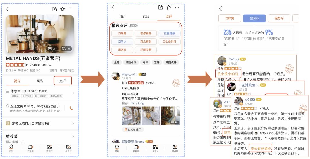 细粒度情感分析的重要应用场景之一是大众点评的精选点评模块,如图10所示。精选点评模块作为点评App用户查看高质量评论的入口,其中精选点评标签承载着结构化内容聚合的作用,支撑着用户高效查找目标UGC内容的需求。细粒度情感分析能够从不同的维度去挖掘评论的情感倾向。基于细粒度情感分析的情感标签能够较好地帮助用户筛选查看,同时外露更多的POI信息,帮助用户高效的从评论中获取消费指南。