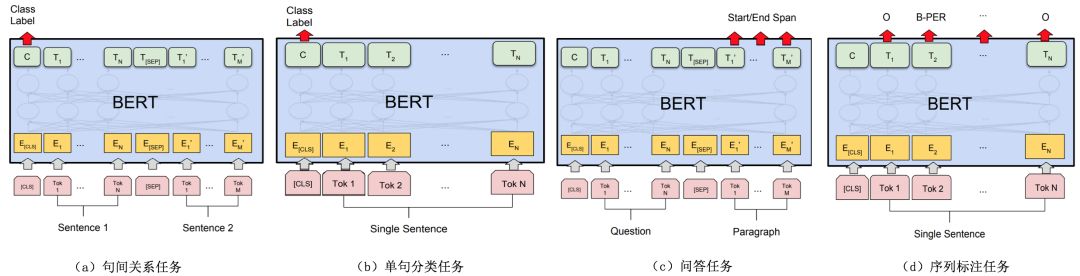 图8展示了基于BERT模型微调可以支持的任务类型,包括句对分类、单句分类、问答(机器阅读理解)和序列标注任务。