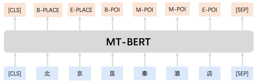 在酒店搜索Query成分分析中,我们对标签采用“BME”编码格式,即对一个实体,第一个字需要预测成实体的开始B,最后一个字需要预测成实体的结束E,中间部分则为M。以图13中酒店搜索Query成分分析为例,对于Query “北京昆泰酒店”,成分分析模型需要将“北京”识别成地点,而“昆泰酒店”识别成POI。MT-BERT预测高频酒店Query成分后通过缓存提供线上服务,结合后续召回策略,显著提升了酒店搜索的订单转化率。