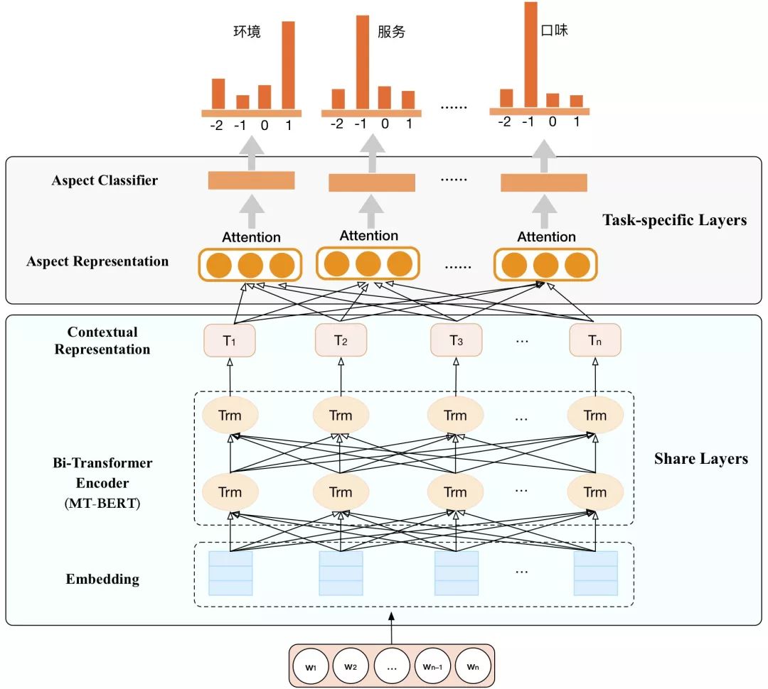 针对细粒度情感分析任务,我们设计了基于MT-BERT的多任务分类模型,模型结构如图9所示。模型架构整体分为两部分:一部分是各情感维度的参数共享层(Share Layers),另一部分为各情感维度的参数独享层(Task-specific Layers)。其中参数共享层采用了MT-BERT预训练语言模型得到文本的上下文表征。MT-BERT依赖其深层网络结构以及海量数据预训练,可以更好的表征上下文信息,尤其擅长提取深层次的语义信息。参数独享层采用多路并行的Attention+Softmax组合结构,对文本在各个属性上的情感倾向进行分类预测。通过MT-BERT优化后的细粒度情感分析模型在Macro-F1上取得了显著提升。