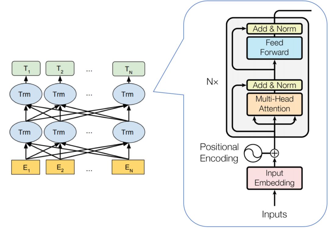 BERT是基于Transformer的深度双向语言表征模型,基本结构如图2所示,本质上是利用Transformer结构构造了一个多层双向的Encoder网络。Transformer是Google在2017年提出的基于自注意力机制(Self-attention)的深层模型,在包括机器翻译在内的多项NLP任务上效果显著,超过RNN且训练速度更快。不到一年时间内,Transformer已经取代RNN成为神经网络机器翻译的State-Of-The-Art(SOTA)模型,包括谷歌、微软、百度、阿里、腾讯等公司的线上机器翻译模型都已替换为Transformer模型。关于Transformer的详细介绍可以参考Google论文《Attention is all you need》[3]。
