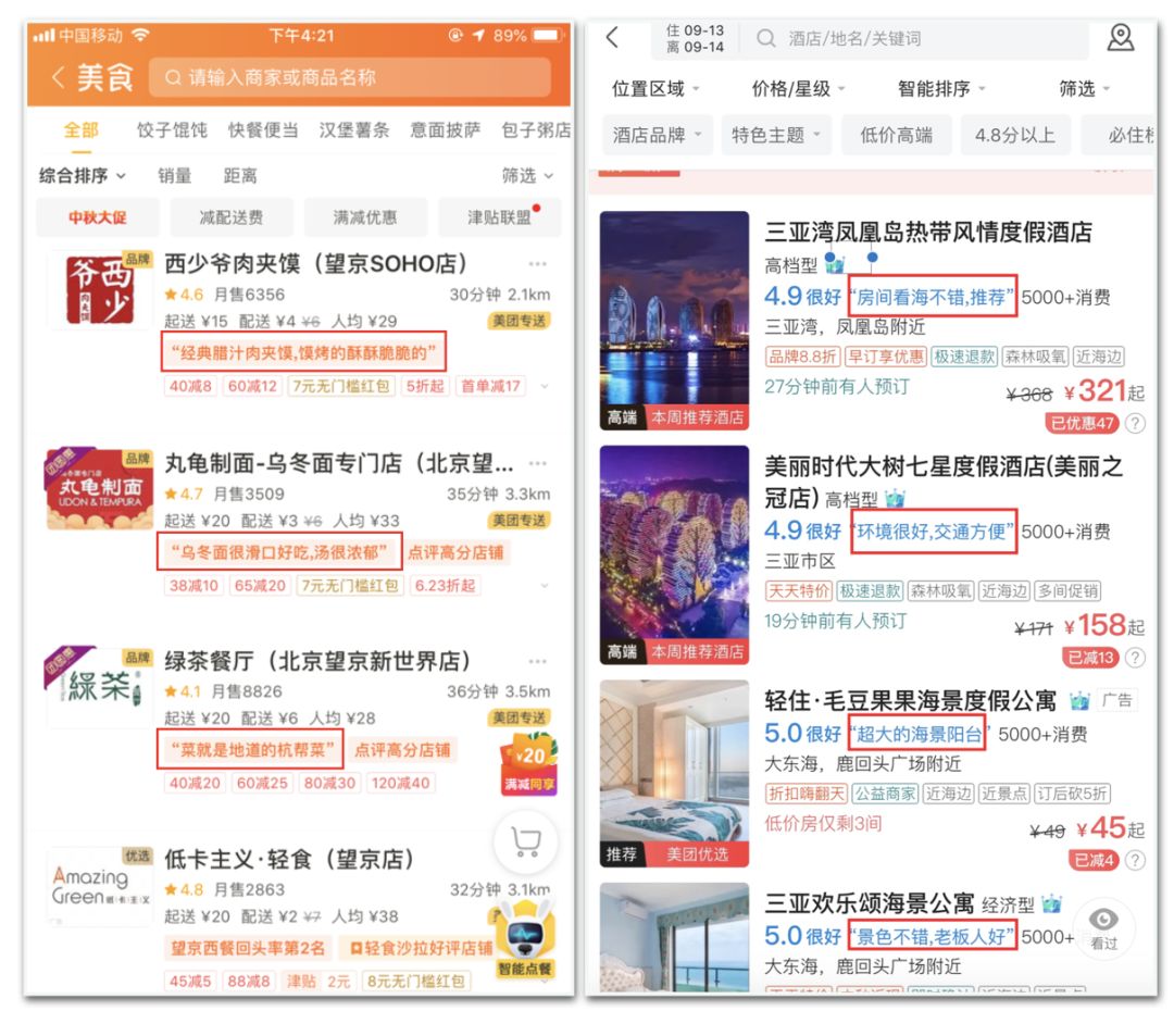 对于不同的业务场景,对推荐理由会有不同的要求。在外卖搜索场景下,用户可能更为关注菜品和配送速度,不太关注餐馆的就餐环境和空间,这种情况下只保留符合外卖场景的推荐理由进行展示。同样地,在酒店搜索场景下,用户可能更为关注酒店特色相关的推荐理由(如交通是否方便,酒店是否近海近景区等)。