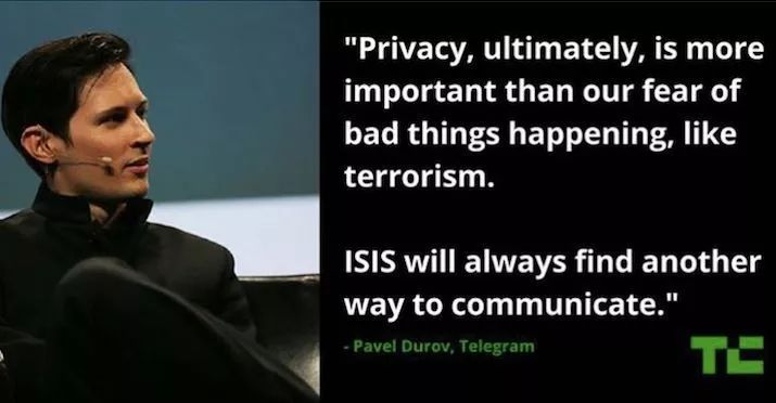在 2015 年 TechCrunch Disrupt 旧金山大会的舞台上,杜罗夫承认了 ISIS 正在使用 Telegram,并跟主持人进行了以下的对话: