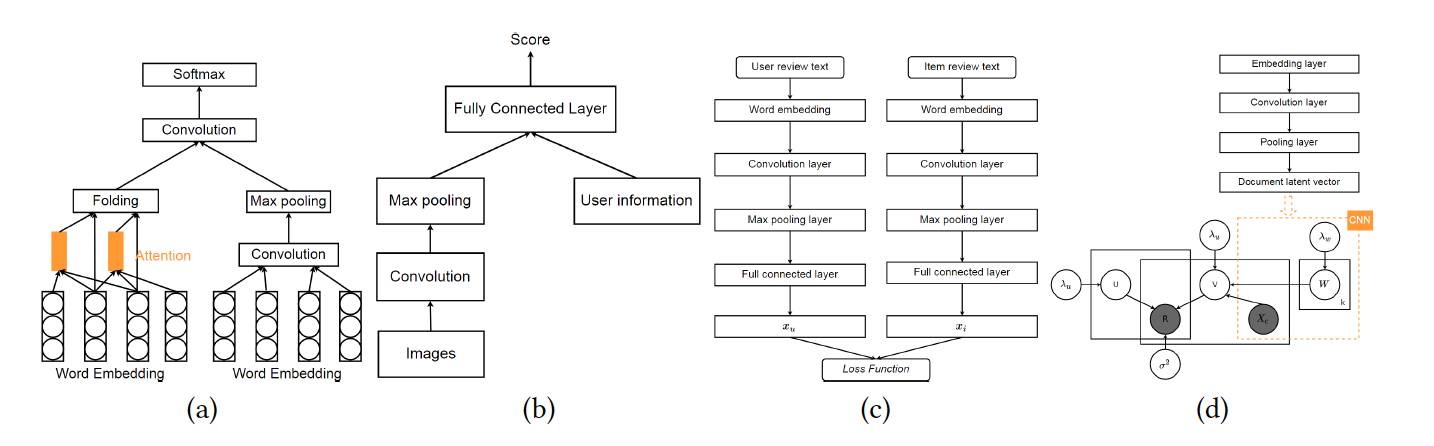 图 6:(a)基于 Attention 的 CNN;(b)个性化 CNN 标签推荐;(c)DeepCoNN;(d)ConvMF。