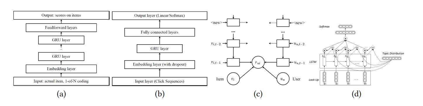 图 7:(a)借助 RNN 的 Session 推荐;(b)借助 RNN 的完善的 Session 推荐;(c)循环推荐网络;(d)用于标签推荐的基于 Attention 的 RNN。