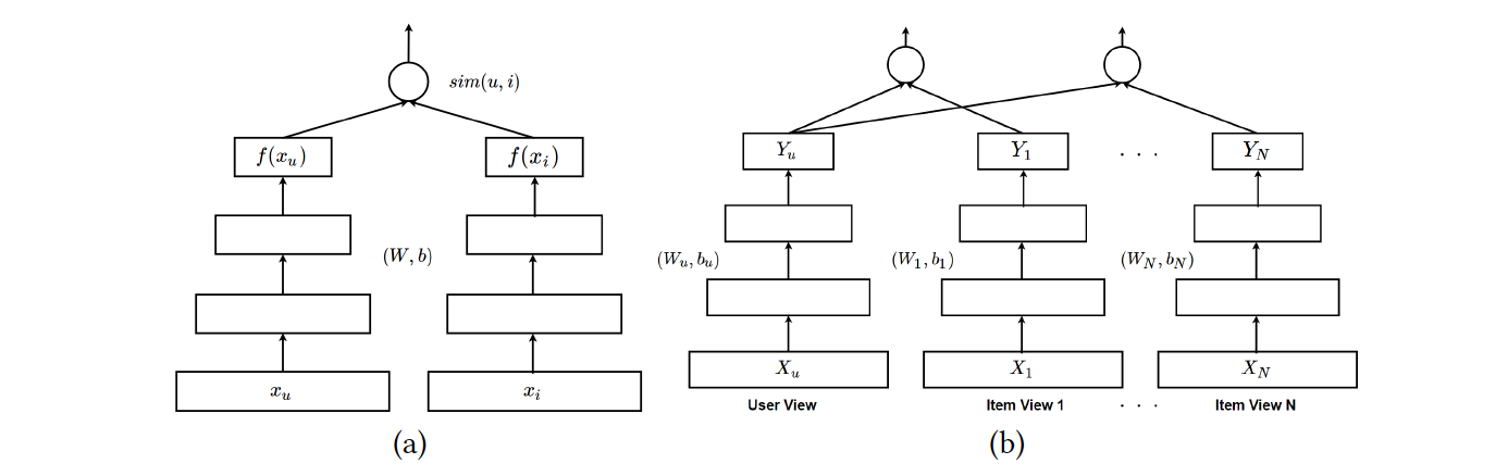 图 8:(a)基于深度语义相似性的个性化推荐;(b)多视角深度神经网络。