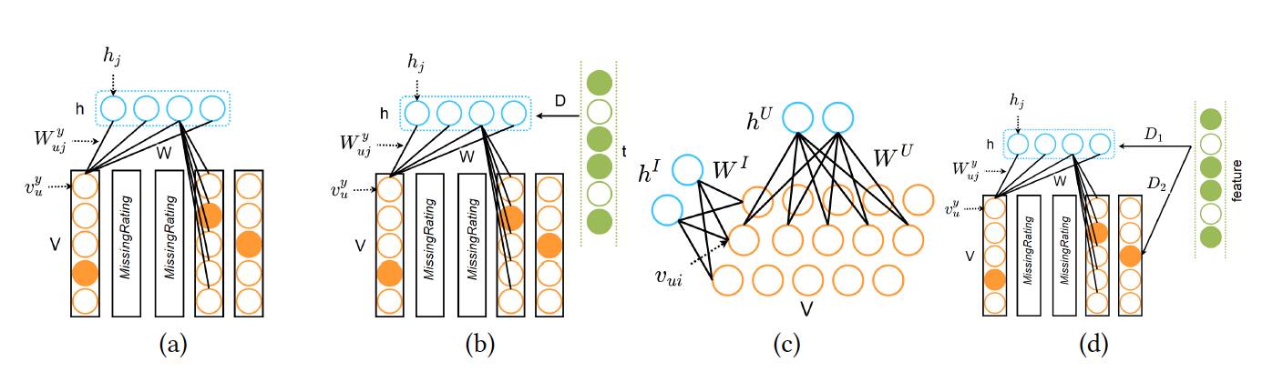 图 9:(a)RBM-CF;(b)带有隐式反馈的条件性 RBM-CF;(c)基于用户和基于项目的 RBM-CF 的组合;(d)混合 RBM-CF。