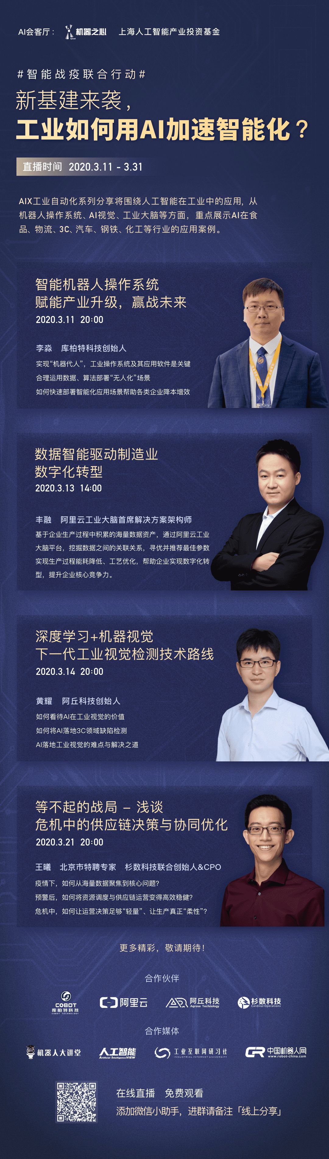 在线分享活动第二个系列-AIx 工业自动化将重点关注人工智能在工业中的应用,覆盖协作机器人、工业 AI 视觉、智能供应链、工业大脑等产业热点话题。从 3 月 11 日起,整个 3 月精彩不断,多位顶级专家倾囊分享,为大家带来一场产业革新的盛宴。