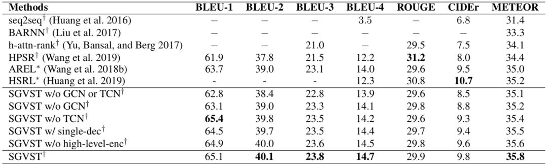 表1:在VIST数据集上的不同模型性能比较. *代表直接优化RL奖励,比如CIDEr分数,