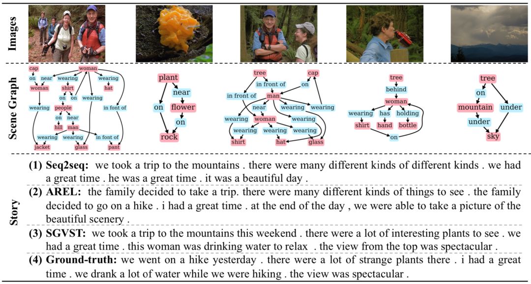 图4展示了3种不同模型生成的故事和真实故事的样例。第一行是输入的一个图像序列。第二行是生成出的场景图。第三行是不同模型生成的故事。可以看出SGVST生成的故事更通顺,而且信息更丰富、更有表现力。